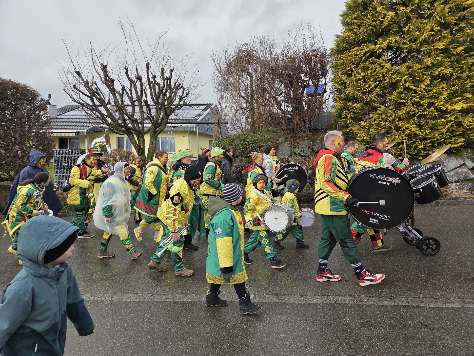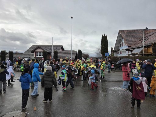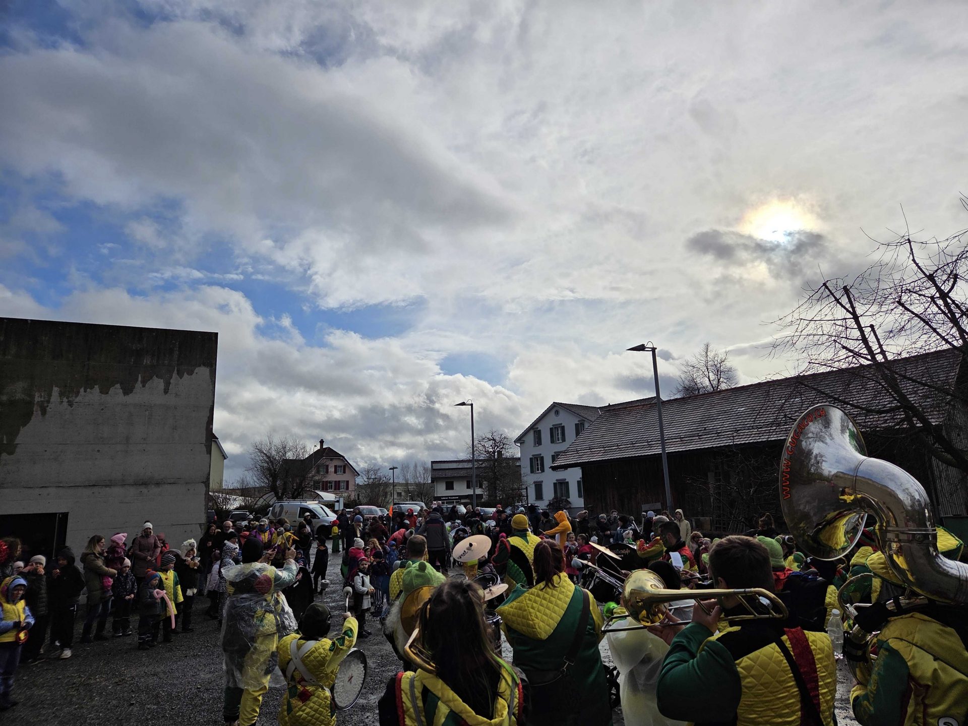 Der Kinderfasnachtsumzug mit der Guggenmusik Gassenchlöpfer aus Gossau begann zunächst mit bangem Blick zum Himmel. Das Wetter hielt viele Familien zuhause, und so blieb die sonst grosse Kinder- und Elternschar diesmal etwas kleiner. Doch pünktlich zum ersten kräftigen Ton der Guggenmusik geschah fast schon Fasnachtszauber: Die Wolken verzogen sich teilweise und liessen der Sonne platz. So strahlte die Sonne mit den bunten Kostümen um die Wette.