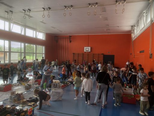 Das gab es noch nie! Der Kinderflohmarkt musste in die Turnhalle verlegt werden – aber nicht etwa wegen schlechtem Wetter, sondern aufgrund der Hitzewelle. So wurden die vielen Auslagen der etwa 30 Verkaufswilligen in der Halle ausgebreitet und das rege Handeln konnte starten. Für Speis und vor allem Trank sorgte wiederum die Spielgruppe – in diesem Jahr passend die Indoor-Spielgruppe. Zwar viel der Besucherstrom wetterbedingt etwas geringer aus als im letzten Jahr, dafür floss der Schweissstrom 🙂 Die Kinder gingen aber sicher auch in diesem Jahr nicht mit leeren Händen nach Hause. Wir freuen uns bereits wieder auf den Kinderflohmarkt im 2024, dann hoffentlich wieder auf dem Pausenplatz.