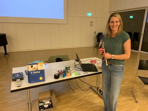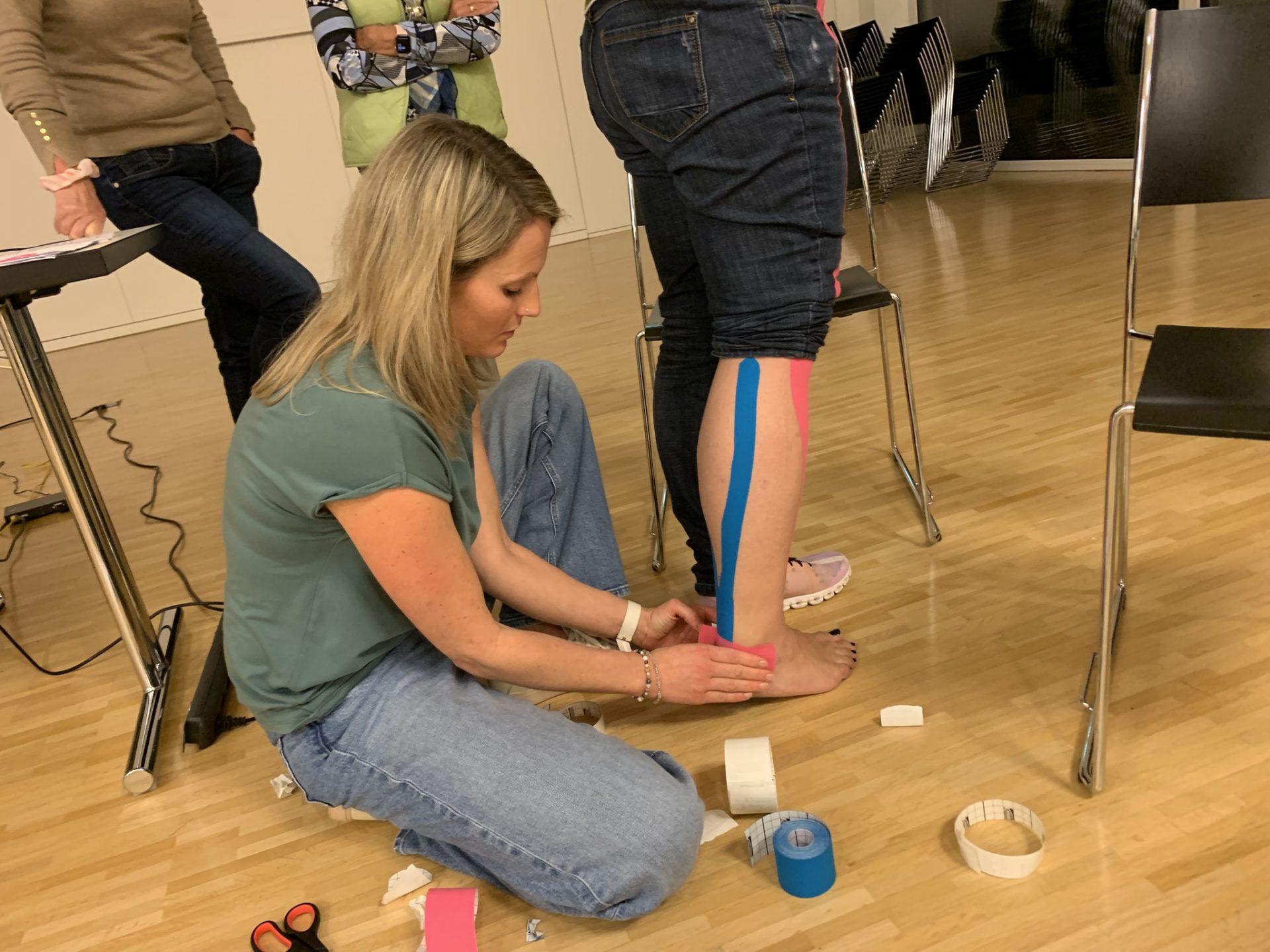Ein spannender Abend erwartete uns: Physiotherapeutin Karin Koch führte uns in die faszinierende Welt des Tapings ein – von den verschiedenen Techniken über die Eigenschaften der Tapes bis hin zu ihrer Wirkungsweise im Körper. Sie erklärte Indikationen und Taping-Regeln und zeigte die praktische Anwendung direkt an Teilnehmerinnen. Fragen wurden anschaulich beantwortet und die Prinzipien des Tapens standen dabei stets im Mittelpunkt: Intuitives Arbeiten, auf Körpersignale hören und achtsam reagieren. Trotz der anschaulichen und zugänglichen Vermittlung wurde deutlich, dass spezifische körperliche Beschwerden nicht einfach zu behandeln sind und trotz allem die Begleitung einer therapeutischen Fachperson erfordern.