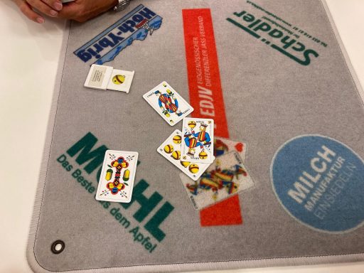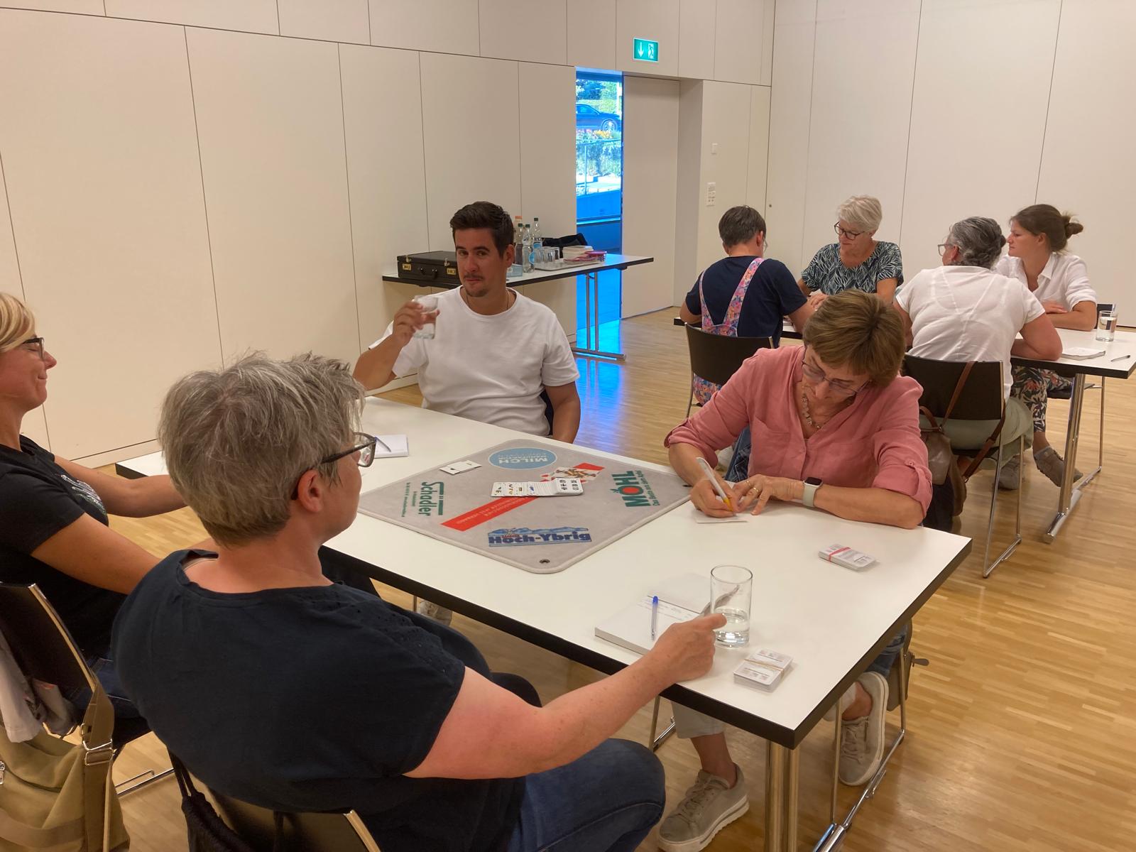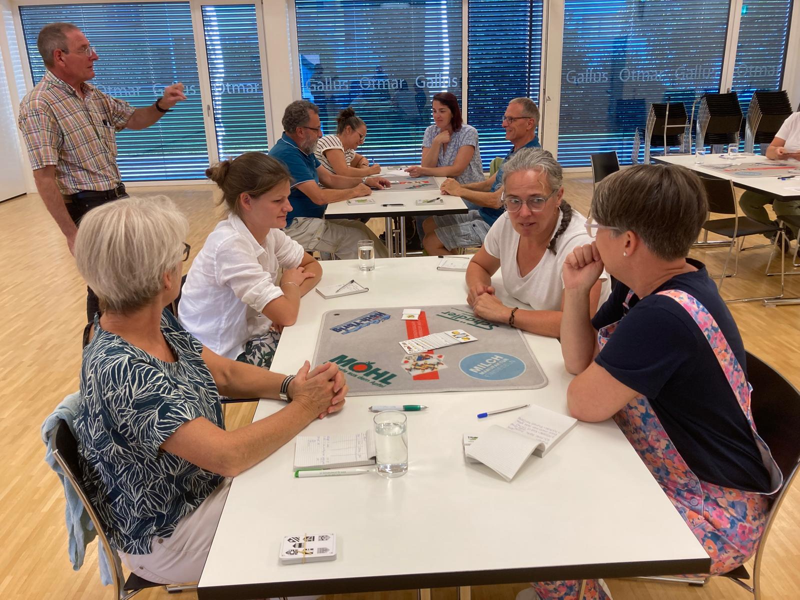 Am 18. August 2025 trafen sich erstmals 14 mutige Frauen und Männer im Otmarzentrum, um gemeinsam das nationale Kartenspiel zu erlernen oder zu verbessern. Daniel Müller aus Wil, ein leidenschaftlicher Meisterschafts-Jasser, führte die Gruppe nun nach und nach ins Jassen ein. An den folgenden Abenden wurde fleissig zählen geübt, Trümpfe kennengelernt und in verschieden Kombinationen von Jass-Gruppen gleich beim Hand-Jass und Schieberjass angewendet. Unter dem Motto «Stöck, Wys und Stich» konnten am letzten Abend nun alle ihr Wissen bei einer kleinen Meisterschaft in der Runde anwenden. Nun gilt es, fleissig weiter zu üben und das Gelernte in der Familie, während den Ferien und an geselligen Abenden in Restaurants anzuwenden. Gut «Jass»!