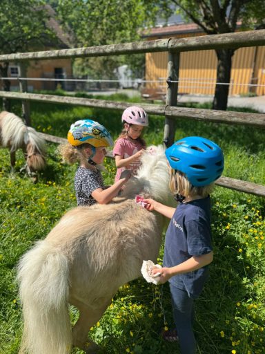 12 Mädchen im Alter von 4 bis 8 Jahren freuten sich, mit den Ponys des Reiterhofes Zellersmüli in Herisau, einen erlebnisreichen Nachmittag bei schönem Wetter zu verbringen. Nach einer allgemeinen Vorstellungs- und Einführungsrunde mit den drei Betreuerinnen ging es dann auch schon los. Die Mädchen durften gemeinsam drei Ponys striegeln, bürsten und satteln. Im Anschluss ging es auf den Pony-Jahrmarkt, wo man vom Pony aus Entenangeln, Ringe werfen u.v.m. machen konnte. Dabei sass immer ein Kind auf dem Pony, eins führte das Pony unter Anleitung und am Jahrmarktstand war auch jeweils ein Kind. Nach einer wohlverdienten Zvieripause ging es nochmal auf den Reitplatz, um dieses Mal Miniponys mit schicken Blumen und Zöpfen zu verschönern. Zu schnell gingen die zwei Stunden mit den lieben Ponys und Miniponys für die Mädchen um, denn alle hatten sehr viel Spass!