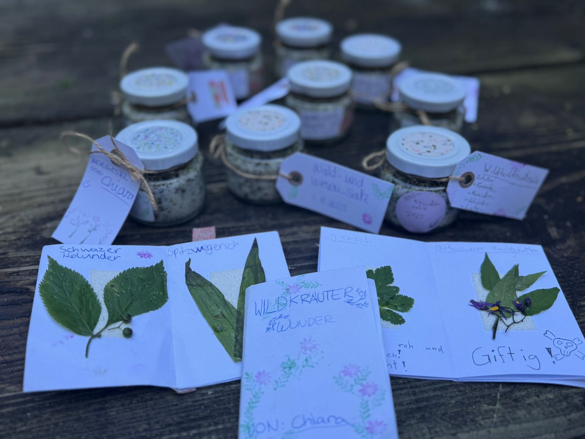 Das erste Mal durften wir den Kräuterspaziergang mit Lilly als Tourgide durchführen. 13 Kinder haben am Anlass teilgenommen und viele Infos über essbare Kräuter, Heilkräuter und den Unterschied zu den Kräutern gelernt die man lieber links liegen lässt. Mit den vielen gesammelten Kräutern haben alle zusammen leckere Kräuterquarks, Kräuterbutter und Kräutersirup erstellt und auch gleich zum Zvieri gegessen/getrunken. Das erstellte Kräutersalz sowie ein kleines Infobuch, welches die Kinder während des Spaziergangs beschriftet und beklebt haben, durften sie am Ende des Anlasses um 17.30 Uhr mit nach Hause nehmen.