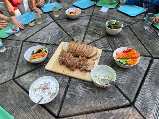 Nach dem steilen Aufstieg zum Weingut Burkhart in Weinfelden nahmen wir dankend ein Glas Wasser entgegen, bevor uns ein prickelnder Apfel-Trauben-Schaumwein serviert wurde. Sympathisch und kompetent wurden wir durch den Rebberg und den Weinkeller geführt und durften diverse Weinsorten degustieren. Das leckere Vesperplättli bei herrlicher Abendsonne war der Höhepunkt des Nachmittags. Beim süssen Dessertwein angekommen beschlossen wir in gemütlicher Runde, den Zug eine Stunde später zu nehmen. Diesen Entscheid bereuten wir dann aber ein wenig, als wir in Arnegg mit Gewitter und strömendem Regen empfangen wurden.